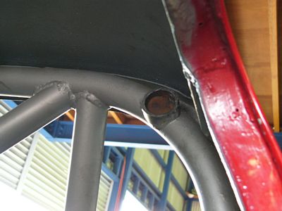 まあそれはそれとして、この車にはレース装備の名残があちこちにあるのですが、張り巡らされたロールバーもそのひとつ。ところが、Aピラーまで延びるごっついロールバーは車体各部に溶接されてしまっており、これが邪魔になってフロントガラスを取り付けられないとのこと。 で、すっぱりと切ってもらっちゃいました。