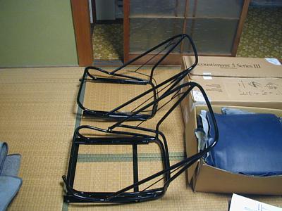 中のスポンジはクッキーのようにボロボロだったので適当に作り直し、変なモケットが張ってあった表皮も、安くて丈夫なレザーに張り替えるつもりです。