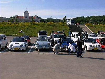 広島市郊外「ニュージーランド村」で行われた旧車のヒルクライムを見に行ってきました。 フェラーリ、ポルシェ、ロータス、ジャガー・・・世界の名車が勢揃い、 ミニなんてまるでカローラのようにうようよ。なんだか別世界のようでした。 写真は現地でおちあったAZ−1たちとの記念撮影。孫に囲まれたおじいさんのようです。