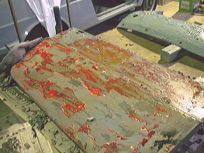 写真は右ドアですが、現在の水色の下に、白(サフェーサー)、赤、パテ(笑)、赤、 ブルーグレー(オリジナル色)が重なっていました。 水色を塗る際にかなり大掛かりなパテ修理が行われていたようです。 左右ドア、ボンネット、エンジンフード、フロントカウル、前後スカートなどは、今後