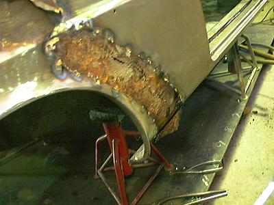 が、ボディ外板に数箇所あてられた鉄板のパッチをはがしてみると・・・ クーペというのは実にいい加減な車です。ボディのあちこちに隙間があって、 そこにスポンジを詰め込んでシーラーを塗ってあるのです。 スポンジに水が染み込むと、そこの外板が錆びて腐るという寸法で、 写真の部分も裏側のシーラーの形状どおり錆びています。