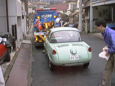 待つことしばし、やさしいおにいさんとともにトラック到着。とりあえず家まで運びました、というところの写真が上のもの。右でタオル持って濡れた車体を拭こうとしているバカ面が私です。