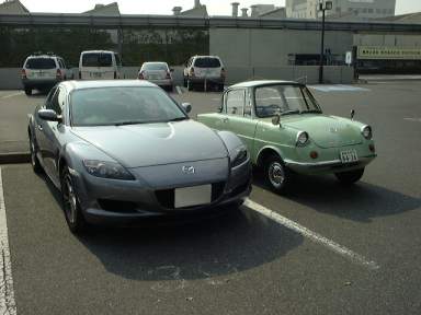 写真はこういうイベントならでは、念願のRX−8と勝手に2ショットの模様です。背景はクーペのふるさと、マツダ本社工場。感慨ひとしおです。
