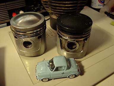 スペアエンジンの状態が心配でしたが、油泥でコテコテにモスボール処理されたスペアのシリンダーとピストンは思いのほか程度がよく、まずはほっとひと息。写真の右が旧ピストン、左がせっせと磨いたスペアエンジンピストンです。