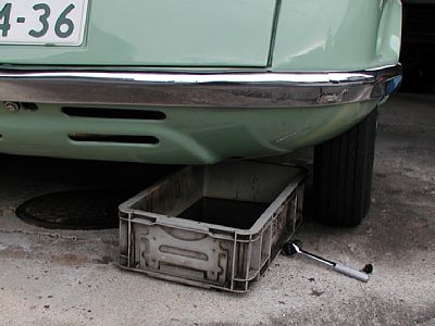久しぶりにオイル交換。ドライサンプなので交換は簡単。オイルはカストロールRS(10W-50)を使います。 ちなみにバンパーの下にあるキーシリンダーはエンジンフードロック。シリンダーそのものを押して開きます。その右の穴はクランク棒で始動するときに使う穴です。いずれも時代を感じさせるアイテムです。
